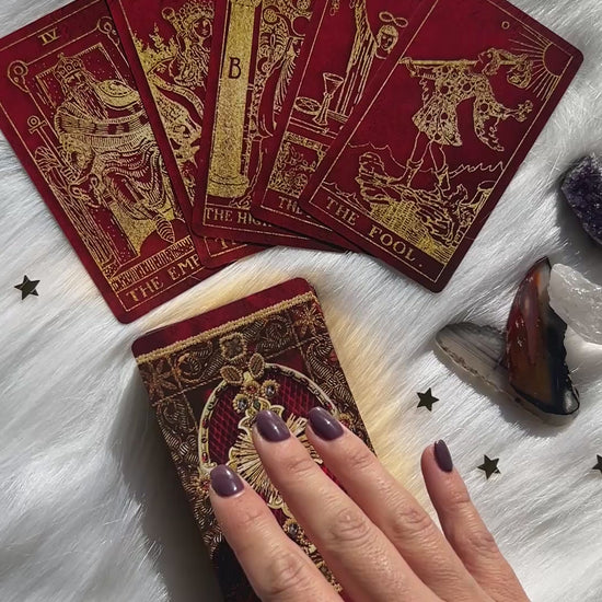 Crimson Renaissance Tarot Cards will have you feeling like royalty with opulent red velvet and gold designs, including luxurious shiny gold gilt edges. This deck follows the classic and ever popular RW cards. the gold elements on the front and back of the design are not foil.